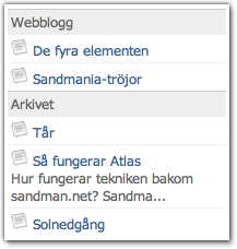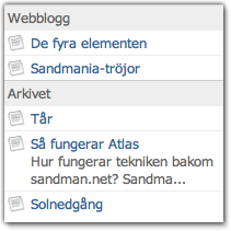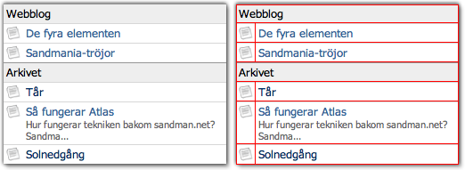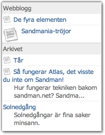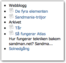 Ovanstående lista består av sju rader vara två är överskrifter och fem är "vanliga". Raderna med överskrifter går över hela bredden medan dom vanliga raderna är uppdelade i två delar, ikonen och texten/länken. Så här ser koden ut för den bilden: