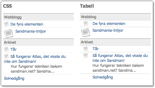 En del kanske skulle säga att man kan sköta detta med absolut positionering, där man sätter ikonen exakt där man vill ha den och texten exakt där man vill ha den. Men då har man ju frångått hela idéen med CSS som ett flöde och börjar positionera objekt som om dom låg i en tabell, och då förlorar man ju lite av idéen med det hela. Och inte nog med det, är en bild större än de andra så måste man ta reda på det INNAN man skriver ut listan och fixa positioneringen utefter den bilden. Med tabeller sköts allt sådant automatiskt.