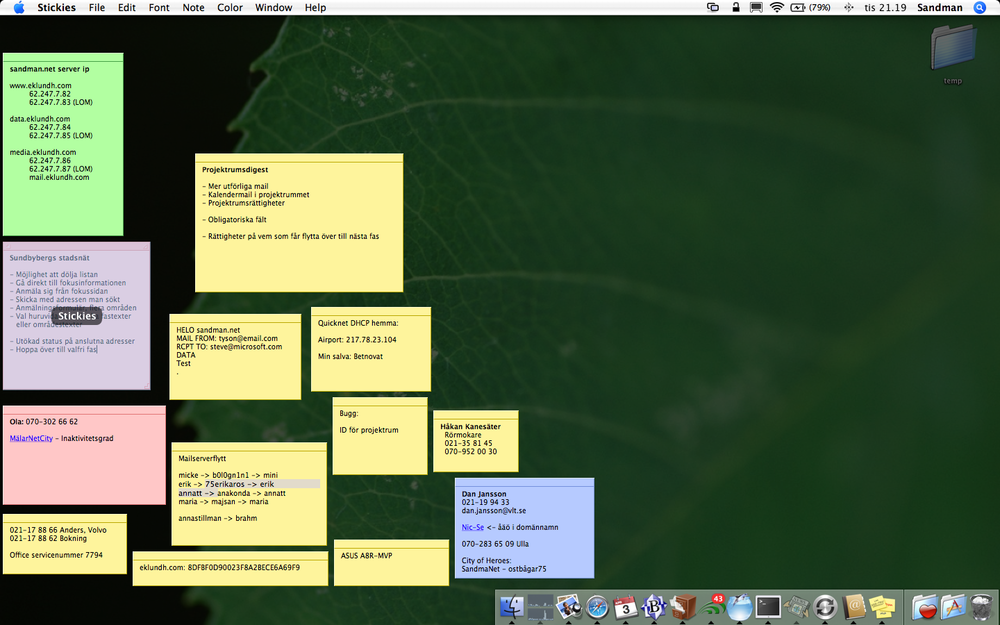 Men använd sedan kortkommandot för att aktivera Exposé på ett programs fönster och alla skickas ut i ett fint mönster så man enkelt ser alla. Eftersom alla lapparna är så små så ryms dom på skärmen utan att förminskas, som Exposé gör oftast. När du är klar, tryck på Äpple-H för att gömma alla. Smidigt! Om man nu bara kunde synkronisera Stickies mellan datorer också!