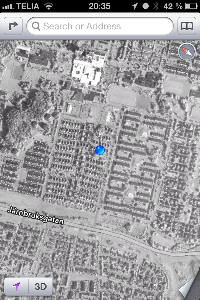 Men kartorna... Ojoj. Apple har ju slängt ut Google Maps och nu kör dom med sina egna kartor. Men det märks att detta inte är helt klart. En ny funktion är "flyover" som har tagit en 2D-bild från ett flygplan och sedan "mappat" hur staden och terrängen ser ut i 3D och sedan klätt in det i 2D-bilden. Ser helt fantastiskt ut där det stöds. Vilket i Sverige är typ Stockholms innerstad. Fine, jag behöver inte den här funktionen direkt, men det ursäktar inte att övriga satellitbilder är svartvita, vad nu? Vad hände där?
