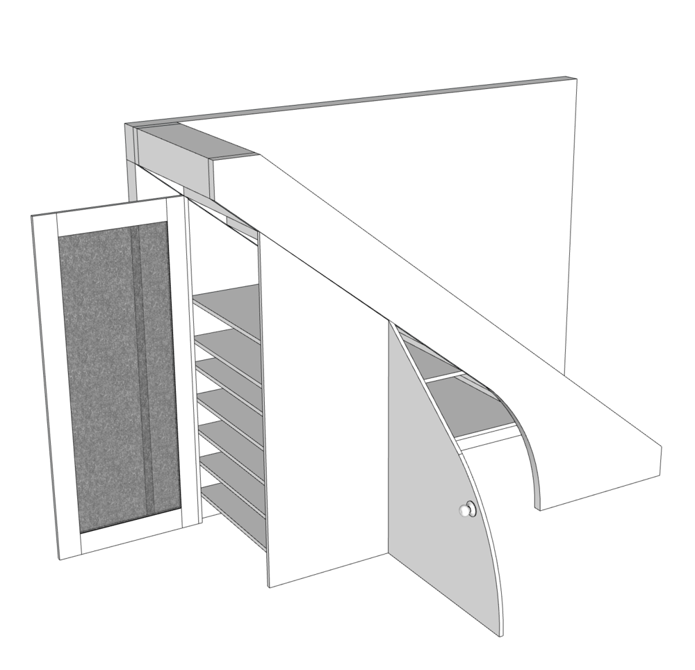 En trappa är ju rätt smidig för att ta sig till från en våning till en annan. Rutschkana är ju nice, men svår åt ena hållet. Så trappan får bli kvar. Men utrymmet under trappan är ju ibland riktigt drygt. Det är en så underlig form så ordentlig förvaring kan vara riktigt klurigt.