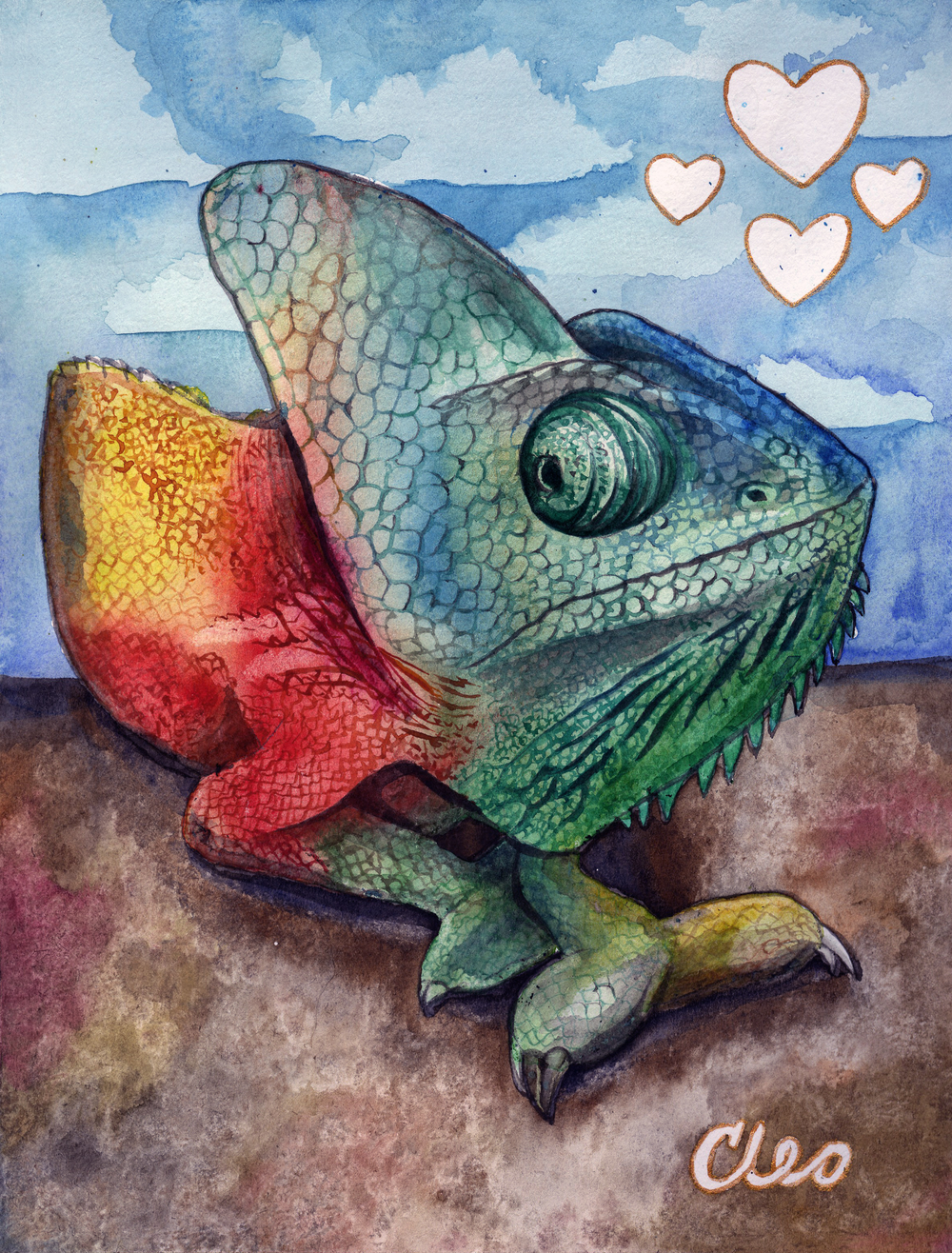 Beställd tavla på en Kameleont. Akvarell på akvarellpapper (A5) och lite guldfärg till detaljer. Väldigt rolig tavla att måla, även om det var sjukt pilligt med alla ojämnheter i huden.