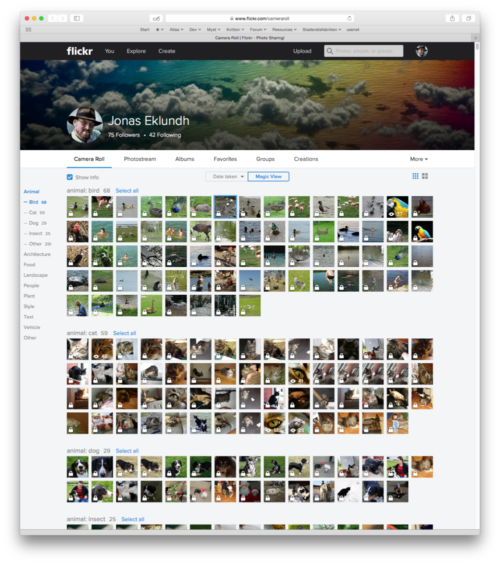 Ny function i Flickr, dom använder någon frän algoritmgrej för att kategorisera dina foton automatiskt, så man kan hitta foton man tagit som är på en katt, ett hus, en cykel eller bara foton med kort skärpedjup eller närbilder på blommor och så vidare. Rätt så fränt! Och jag kanske får tänka om huruvida jag ska fortsätta ladda upp alla mina foton till Flickr eller inte.
