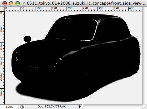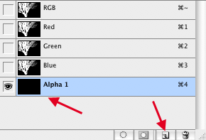 Nu är det dags för masken. Markera först hela ditt dokument och kopiera allt (cmd-C/ctrl-C alltså). I Channels-paletten så skapar du ett nytt lager, som automatiskt kallas för Alpha 1 och är helt svart. Det här är en transparens-kanal i dokumentet och allt svart är genomskinligt och allt vitt är ogenomskinligt och gråtoner är semitransparenta. Vi har inte så mycket gråtoner (beroende på hur starkt du frätte ut vid svart/vitt och Brightness/Contrast).
