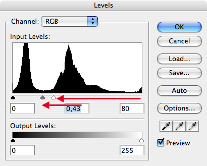 Använd Image->Adjustments->Levels... för att ställa in färgnivåerna på bilderna till något som bränner ut det vita och maximerar svärtan. Detta separerar max och minimivärdena. Var nog med att inte dra handtaget längst till vänster något, utan det är mellantonerna och högtonerna vi fokuserar på.