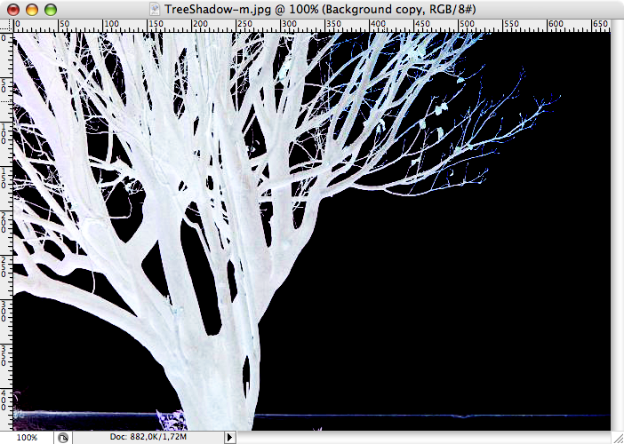 Välj nu Image-Adjustments->Invert för att invertera färgvärdena i hela bilden. Då ser det ut så här. Problemet är att vi har en hel del blåa pixlar ute på vissa kvistar, det är inte bra.