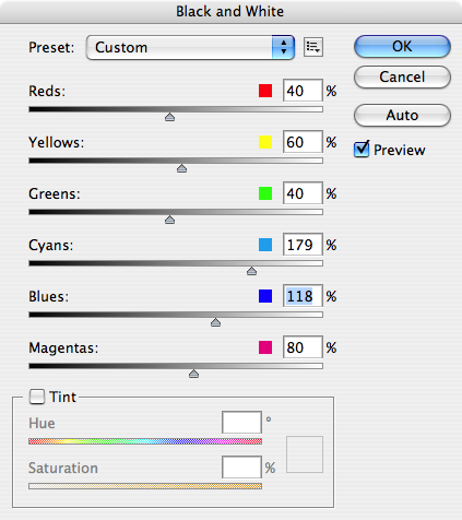 Välj då Image-Adjustments->Black & White... (Photoshop CS3) eller Image->Adjustments->Hue & Saturation (Photoshop CS2). Om du har CS2 så drar du bara ner saturation till 0 och sen är det klart. Men har du CS3 så ser du den här bilden. Där kan du öka värdet på cyan och blå. Kryssa i Preview så du ser resultatet direkt.