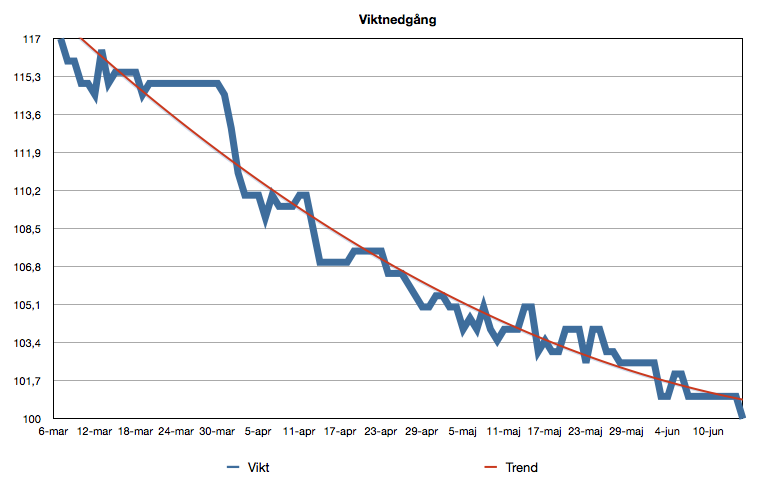 Så jag bestämde mig helt enkelt. Jag började den 6 mars och 17 kilo skulle bort. Och jag nådde det målet drygt tre månader senare, närmare bestämt 14 juni. Jag har nu lagt ett nytt mål på 95 kilo, men det är ändå skojigt att ha nått sitt mål!