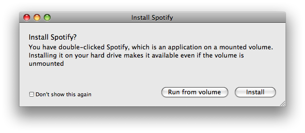 This is what it should look like instead. The window has - just like before - a background image provided by the developer. The dark bar is shown automatically with the name of the application and where it was downloaded from (OSX already keeps track of this) and a button to install. What file is the correct application file is either determined by it being the only application bundle in the disk image, or by a small hidden plist file that only contains a reference to what file it is. Nothing more. If you click the button, that file is copied to /Applications.