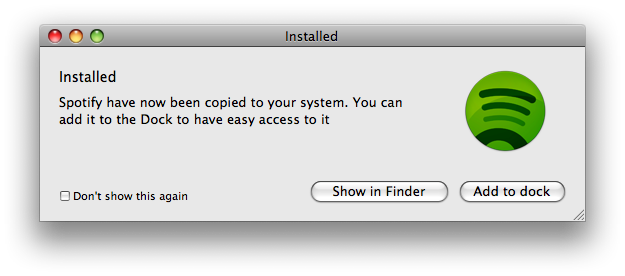 When you're done (either by double-clicking, dragging it to copy or by using the install button) this shows up, asking if you want to add it to the dock as well.