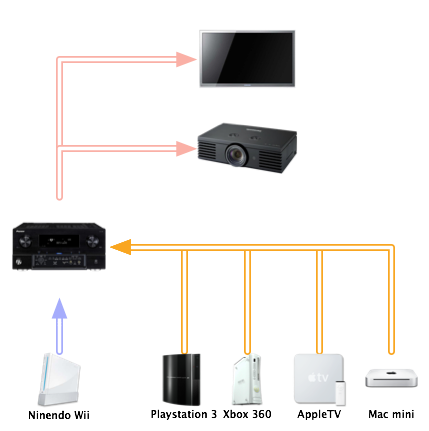 Med en massa prylar sammankopplade i hembion är det lätt hänt att det blir väldigt mycket sladdar. Jag skrev lite om hur alla sladdar hörde ihop i texten Kablage sabotage där jag hade en liten skiss på hur alla sladdar hade dragits. Här syns en skiss på hur det ser ut idag. Mycket mycket trevligare. Med HDMI på nya Mac mini och två HDMI-ut på förstärkaren så drar man ner drastiskt på antal sladdar. Och det känns så mycket mer rent och prydligt.