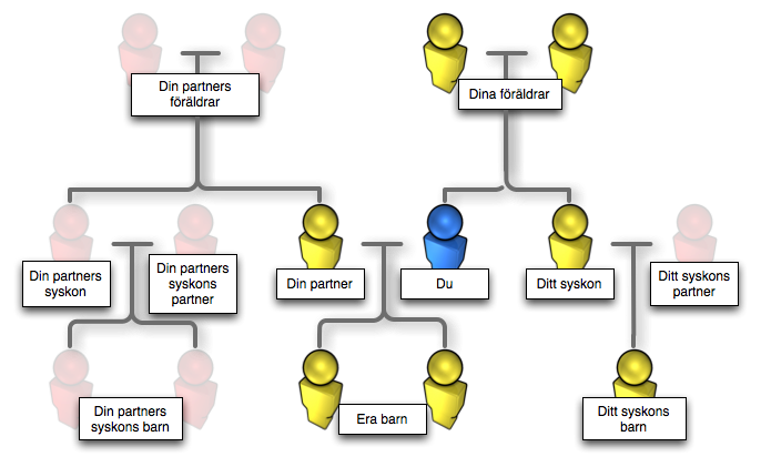 Du själv representeras av den blå personen, medan dom gula avser dem som du bör köpa presenter till och de röde är dom som du inte behöver köpa presenter till (och som i och med detta blir oerhört glada om du ändå gör det).