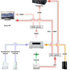 Sen så vill jag ju att allt som går ut från mina källor ska kunnas ses på både TV'n och projektorn. Till det måste jag ha en HDMI splitter eller en HDMI switch. Problemet är att jag har 15-meters kablar som går till båda. Kablarna fixar 1080p utmärkt på den längden. Det är dock lite problem när man lägger in en extra pryl därimellan. Ska man ha en splitter så måste den ha inbyggd signalförstärkning för att signalen ska fungera på så långt avstånd. Jag har testat en splitter men den fixade det inte. Gefen har en också, som jag ska försöka få tag på så jag kan skicka tillbaka den om den inte fungerar.