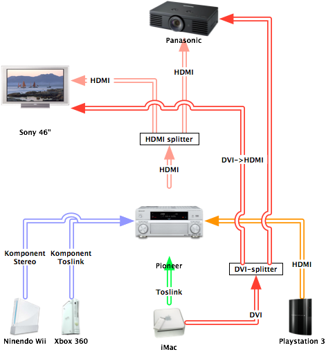Så, om man tittar på kabelschemat på bilden så har jag alltså redan en fungerande DVI-splitter för Mac minin. Det krävdes ju för att Mac minin tappade ju kontakten med förstärkaren när den inte var vald som input, så när man skulle välja tillbaka den så blev det bara tomt. Så den har alltså egen kabeldragning och egen input på TV'n och projektorn. Detta funkar skitbra. Den splittern har inga problem med att skicka DVI-signalen 15 meter över en HDMI-kabel.