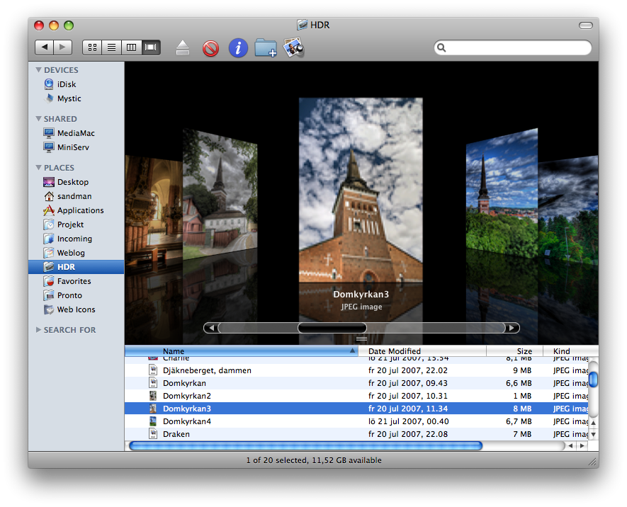 Findern är upphottad också, med en bättre sidebar, bättre nätverksbrowser och sådant. Men sen har den fått en ny vy, som heter Coverflow, som jag inte riktigt förstår poängen med. Det är väl ok när man ser det som ovan, men med övriga filer och program, och framförallt mappar så är det rätt så onödigt. Men den har också en funktion som heter quicklook vilket kan förhandsvisa en hög olika filformat utan att starta programmet för det. Det är ruskigt smidigt i vissa lägen