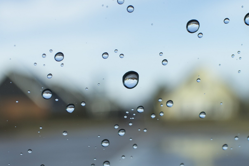 Regndroppe som reflekterar husen i bakgrunden. Livet i en regndroppe!