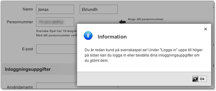 När jag fyller i mitt personnummer där så säger sidan att jag är redan kund och jag ska logga in eller be om mina inloggningsuppgifter! Haha, tillbaka till ruta ett!