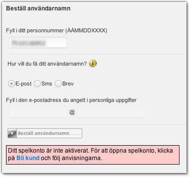 Där fyller jag i mitt personnummer, varpå jag får reda på att jag har ett konto men det är tydligen inte aktiverat, det gör jag på "Bli kund", vilket jag klickar på.