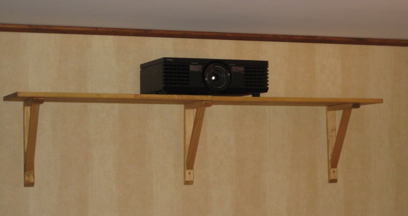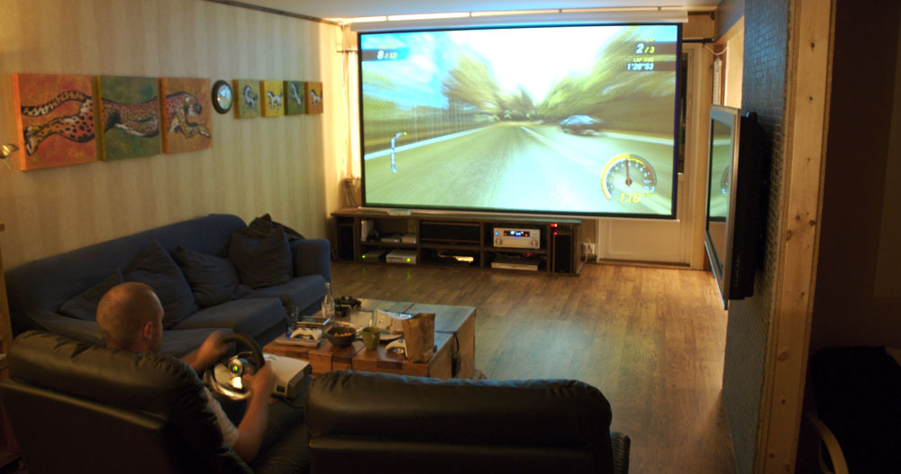 Åh, den är ett helt kapitel i sig själv. Det är en med full 1080p-upplösning och hela 11000:1 i kontrastomfång, vilket betyder att det är inga problem att se på film mitt på dagen eller att spela spel utan att släcka ned i hela rummet. Helt fantastisk projektor och väl värd varenda krona. Matas med HDMI via suprakabel. Den står på en hylla på väggen så att kablarna kommer via ett hål från rummet bakom, för att det ska se snyggt ut.