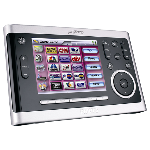 Jag slog på stort och införskaffade mig en för att styra allt. Jag testade en hel del andra lösningar först, inklusive Logitech Harmony 1000, men Pronton är lätt den bästa. Den är verkligen helt otrolig. Philips flaggskepp av fjärrkontroller. Den har en upplösning på 640x480 och man har full frihet att redigera gränssnittet hur man vill. Den är verkligen helt fantastisk. Tyvärr så är det ett Windowsprogram man använder för att redigera den, men det fungerar nu när jag kan ha Windows installerat på min , så jag har med mig konfigurationen till jobbet och hemma.