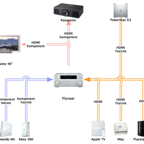 Förstärkaren är ju en Pioneer VSX-AX4ASi-S, som jag valde eftersom den stöder 1080p. Skitbra. Förutom att den är himla bökig att ställa in, gränssnittet för menyer och sådant är riktigt 80-tal och det hela känns väldigt primitivt, så funkar inte allt som jag vill. Till exempel så förlorar min Media-Mac kopplingen till den när den inte är vald, så när man väljer den igen så hoppar den inte igång och tror inte den har en monitor inkopplad. Jag kör DVI->HDMI kabel för den.