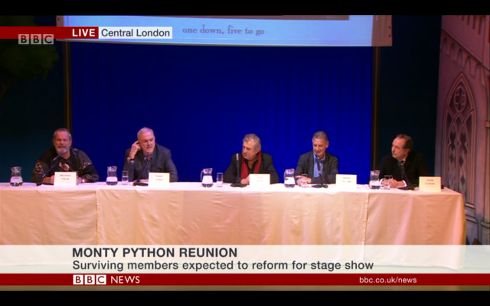 Detta är lite galet, men Monty Python ska återförenas för en live-show. Ja, alla utom en - Graham Chapman gick bort 1989. Men John Cleese, Terry Gilliam, Eric Idle, Terry Jones och Michael Palin ska uppträda. Dom har inte gjort det sedan 1989 (satan vad gammal jag är) och var annars aktiva tillsammans mellan 1969 och 1983.