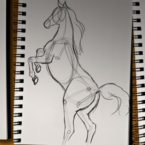 Jag har för övrigt övat mig på att rita hästar, och framförallt att förstå själva anatomin i dem. Lite overkill, men vad tusan. Här är ett exempel på en häst i tre stadier. Inte perfekt, men åt rätt håll i alla fall.