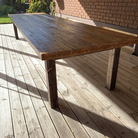 Under det nya altantaket jag byggde i höstas så behövde vi ett nytt bord, så vi köpte tio nya stolar i sådan där konstrotting och så satte jag igång och byggde ett stort bord där många ryms runt. Jag valde att köpa limträbalk och använda dominos för att sätta ihop dem till en stor skiva. Limträbalk är ju rätt så formstabilt vilket var tanken.