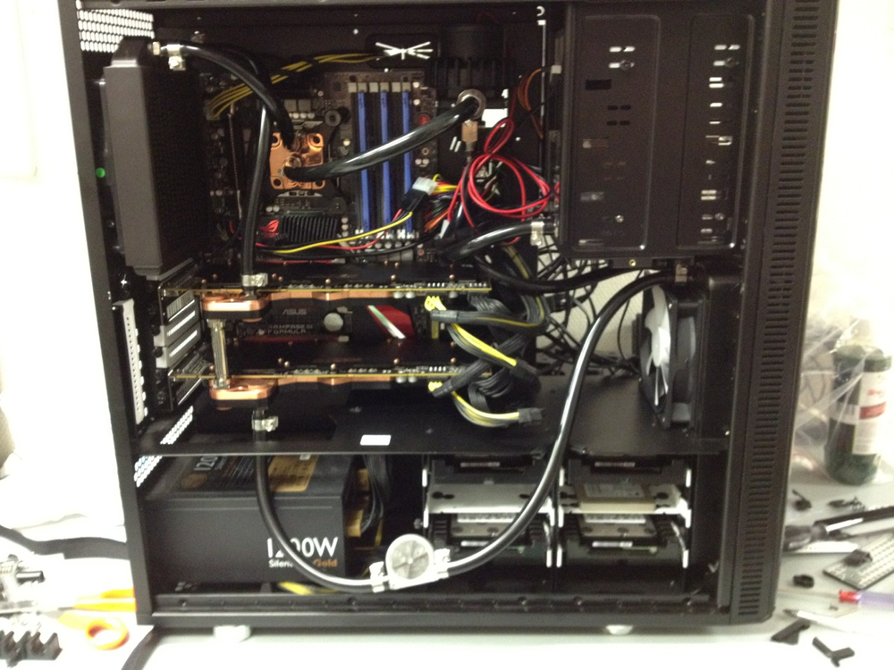 Och här är det färdiga systemet. Det som inte syns är vattentanken som sitter på två 3,5-tumsplatser i fronten. Därifrån går vattnet in i pumpen som är monterad i bakplattan till höger om moderkortet. Den pumpar in vattnet till processorn som är den fyrkantiga kopparfärgade delen i övre vänstra hörnet. Sedan in i bakre radiatorn med en fläkt som kyler ned vattnet. Därefter ned i de två grafikkorten och till slut in i den främre radiatorn som är större och därmed ska ha större kylförmåga.